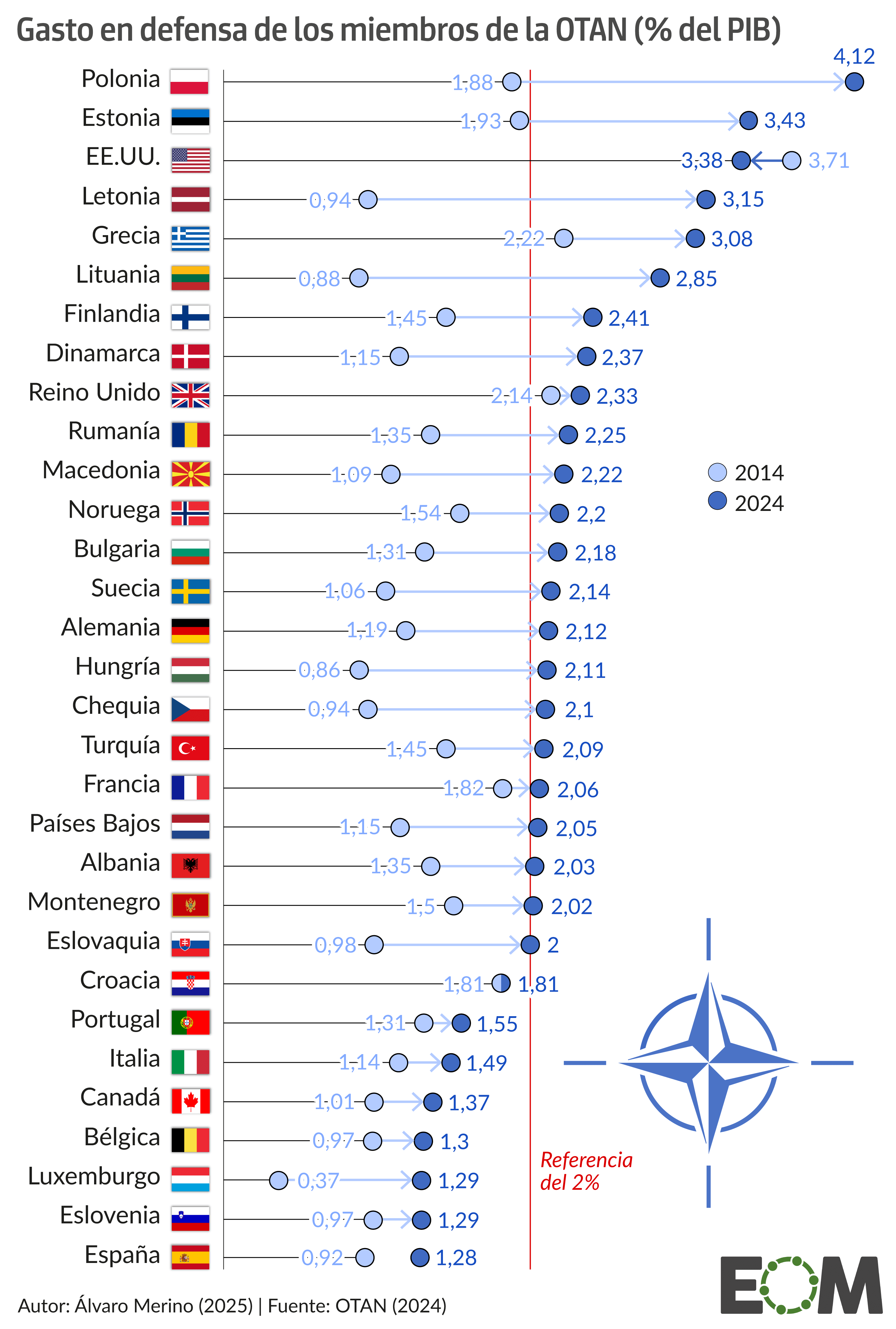 Los jefes de Estado y de Gobierno de la OTAN ya acordaron en 2014 superar de forma conjunta el suelo del 2% para 2024. Rusia acababa de anexionarse la península de Crimea y la alianza entendió que necesitaba tomarse más en serio sus propios objetivos. El gasto en defensa de la OTAN aumentó tímidamente en los siguientes años, pero ha sido necesario el estallido de una guerra a las puertas de Europa para que los miembros de la organización se decidan por fin a destinar más recursos a defensa. Alemania, por ejemplo, rompió con décadas de infrafinanciación y en 2024 sobrepasó el límite del 2% por primera vez desde 1992.